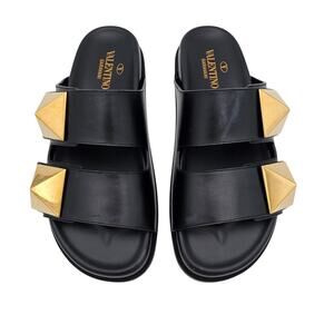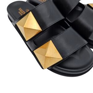 Valentino Garavani One Stud Flat Slide Sandal – Black Leather with Gold Pyramid Studs – Size 37.5 (US 7.5)