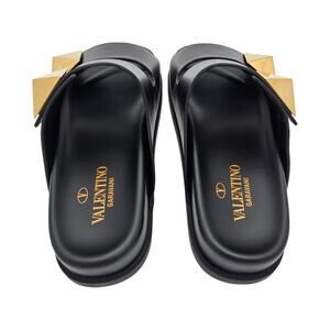 Step into modern luxury with the Valentino Garavani One Stud Flat Slide Sandal. Crafted in sleek black calfskin leather, this Italian-made slide embodies effortless elegance with a bold, contemporary twist. The standout feature is the oversized signature gold pyramid stud, a hallmark of Valentino’s iconic One Stud collection, blending edgy detail with timeless sophistication.
