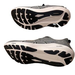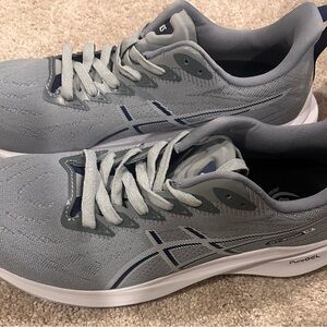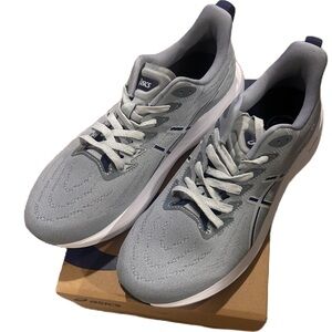 Light gray athletic shoes by Asics. Sleek design with lace-up closure.