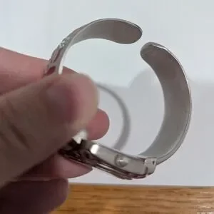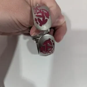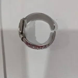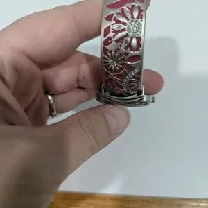 Elegant Accutime women's hinged silver tone watch features a stunning silver and pink floral design with rhinestones. Brand new battery installed. Fits wrists from 6.5" - 10".