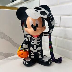 Official Disney Parks 2023 Halloween Skeleton Mickey Mouse Popcorn Bucket featuring glow-in-the-dark (GITD) bones and a pumpkin treat bucket.