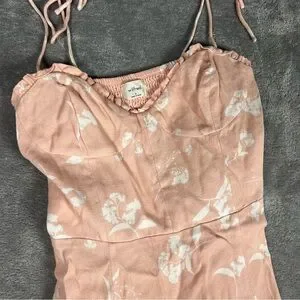 Description- pink in color with a white floral print. Adjustable tying straps. Smocking on the back.