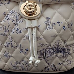 Stylish quilted backpack featuring a unique blue pattern on a white background. Winnie The Pooh Hundred Ares scenes. Backpack is roomy and super soft.