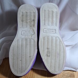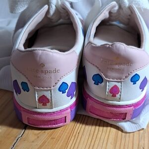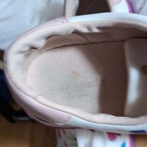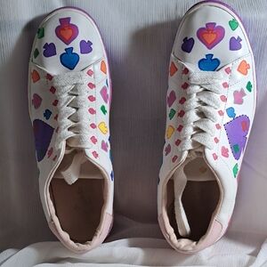 Chic white leather sneakers with pink, orange, purple, yellow, blue and green accents. They have a band of purple and hot pink painted around the bottom of the sole. Well name designer shoes have been upcycled to add more style and color. These are not new, they are gently preloved. I have washed these prior to painting. The inside shows some wear on the heel which is natural with use. Other than that they are in excellent pre-loved condition.