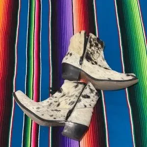 Step out in style with these unique cowhide ankle boots featuring chic fringe detailing. Perfect for adding a touch of rustic charm to any outfit.