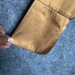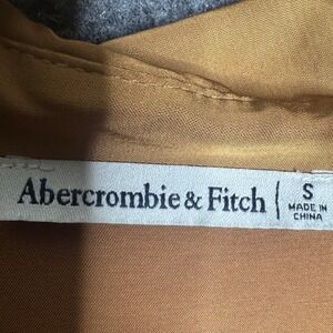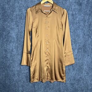 Abercrombie & Fitch satin mini shirt dress in a rich gold tan hue. This chic dress features a classic collared neckline, a button-front closure, and elegant long sleeves with flared cuffs. The smooth satin fabric drapes beautifully for a flattering silhouette. Perfect for a night out or a stylish brunch.
