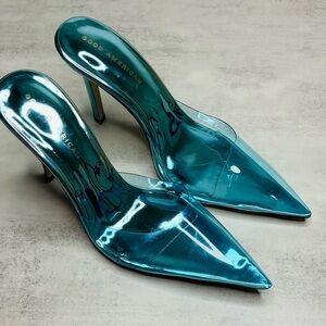 Features a sleek beautiful blue clear upper with a solid sculpted heel for that elevated, minimalist “glass slipper” look — elegant without overdoing it.