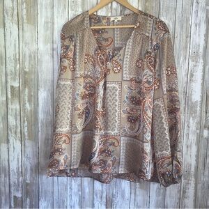 Stylish paisley print blouse with a mix of colors. Perfect for casual or formal wear.