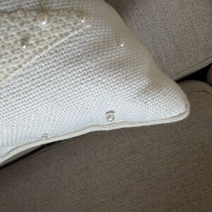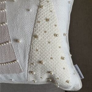 Charming holiday pillow with textured patterns. Features cream and tan designs. Perfect for festive decor.