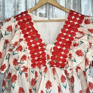 Charming babydoll top featuring a delicate floral print in coral and white. Adorned with a striking V-neckline embellished with geometric trim, flutter sleeves, and a flattering empire waist. Perfect for casual outings or summer gatherings.