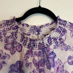Loft Blouse Purple Floral Smocked Neck And Wrist Long Sleeve Size Small