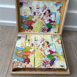 Vintage Eichhorn wooden block puzzle, complete with original wooden storage case. Features classic fairy tale illustrations on wooden blocks — a collectible piece from Germany. Perfect for toy collectors, vintage decor lovers, or nostalgic gift idea! 🌟