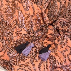 Elegant maxi dress with paisley design. Features flowing sleeves and tassel details. Ideal for special occasions.