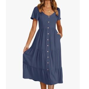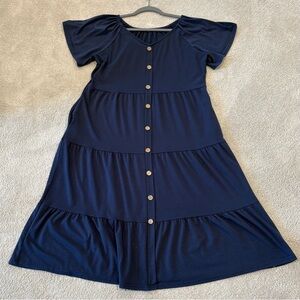 Women Navy Blue Faux Button Short Flutter Sleeve Midi T- Shirt Dress Size XL Pockets Tiered V-Neck Boho Teacher