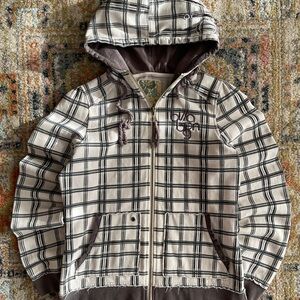 Cozy plaid jacket with a hood. Features front pockets and zip closure. Ideal for cool weather.