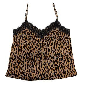 Nordstrom BP Tank Camisole Top Leopard Print in Brown Black with V Neck Black Lace Fringe Spaghetti Straps Side Slits Women Size XS Sexy Sleepwear Cami Animal Print