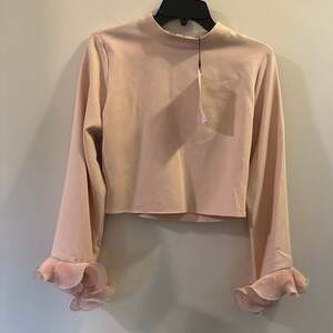 Zara Pleated Ruffle Sleeve Blouse in Peach, Size M — New with tags. This elegant long-sleeve top features a sophisticated mock neck and a trendy cropped silhouette. The standout feature is the dramatic pleated ruffle cuffs that add a touch of romantic flair.