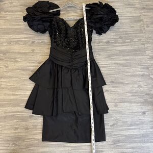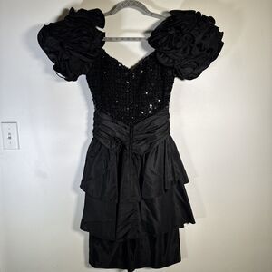 Stunning 80s party dress with sequins and puffy sleeves. Vintage size 10, fits like modern small. Sequin bodice and tiered skirt with slit in back. Measurements in photos.
