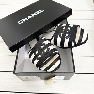 Elegant Chanel mules with bold black and white stripes. Iconic design for a stylish look.
