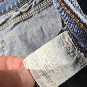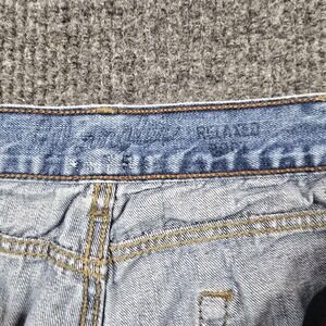 Noticeable wear with frayed hems and overall fading. Light whiskering and creasing; no major holes spotted. Zipper and button function properly. Measures 38x30