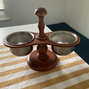 Elegant wooden condiment holder with stainless steel bowls, perfect for any kitchen setting.