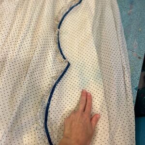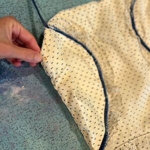 Antique white with blue dots and blue velvet and ruffle trimming