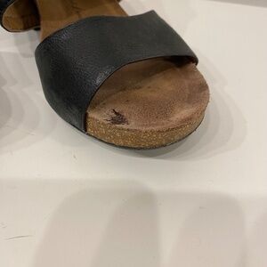 An exotic, one-of-a-kind sandal with bold side zip. Molded cork insole and suede lined footbed with soft foam padding. Leather lining. Black. In excellent condition, a bit of overall wear. Size 7.