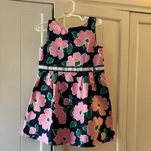 Adorable dress with bold pink flowers. Green leaves add a fresh touch. Ideal for casual outings.