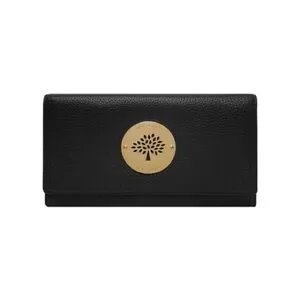 Luxurious Mulberry black leather wallet. The front contains a golden medal featuring a tree. The wallet is perfect for sophistication and stylish outings.