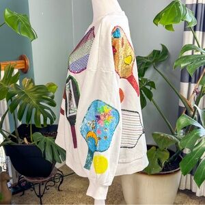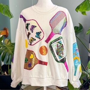 Queen of Sparkles white and multicolored sequined pickle ball crewneck sweatshirt size medium, see pictures for measurements. In excellent condition. Always shipped same or next day. #queenofsparkles #sequin #glam #preppy