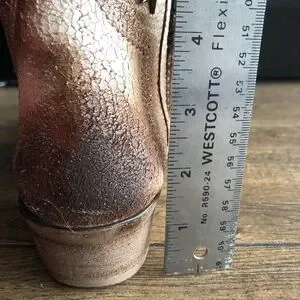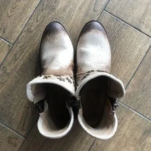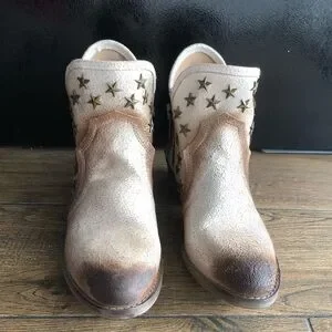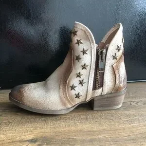 Western style bootie with metal star studs. Sturdy zippers on both sides of boot. Cream and brown distressed real leather. 1.5 inch heel. Non-slip rubber sole.