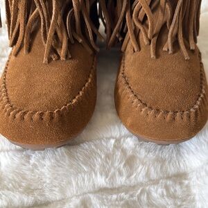 Chic moccasin boots with layered fringe. Soft suede material. Ideal for casual wear.