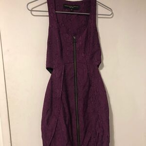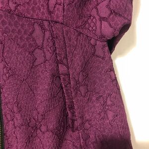 Brand new without tags. Side cut outs and a beautiful burgundy brocade fabric throughout. Heavy metal zipper up the front and tulip skirt with pleating. No flaws