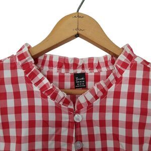 SHEIN Red Gingham Flutter Sleeve Frilled Neck Half Button Blouse NWOT XL 5 0286