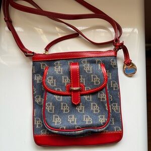 Dooney & Bourke Signature Letter Carrier crossbody bag in denim with red leather trim. Excellent condition.