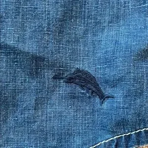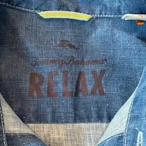 Casual blue button down shirt by Tommy Bahama. Ideal for relaxed settings.