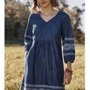J. Jill Denim Embroidered Indigo Peasant Dress Women's Sz Medium Petite
