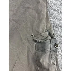 Condition details: Pre-owned womens Kuhl Legendary cargo pants with overall wash wear, color fading, and heavy wrinkling from previous use and storage. Fraying and partial seam separation along the edge of one side cargo pocket flap, a small puncture hole where a rivet or logo piece is missing on one back pocket tab, and a few small light spots and scuffs on the back lower legs as shown. Fabric, zipper, button, belt loops, snaps, and hems remain