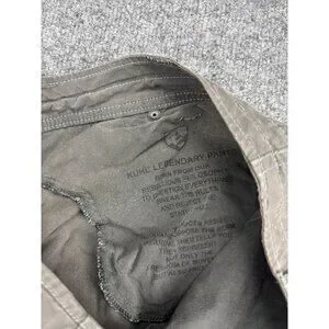 Logos/branding: Inner KUHL waistband label reading 10 REG Made in China, printed interior graphics identifying these as Kuhl Legendary Pants, small KUHL shield logo patch at the back waistband, and branded metal hardware on the front button and snaps.