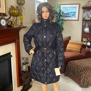 Brand New Michael Kors Black Down Alternative Zippered Faux Fur Hooded Belt Coat. Women’s size Medium. Gorgeous stitching design and gold tone accents!