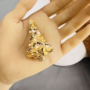 Vint Trifari Brooch 1996 Gold Tone Rhinestone Faux Pearl Christmas Tree Pin 1075