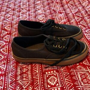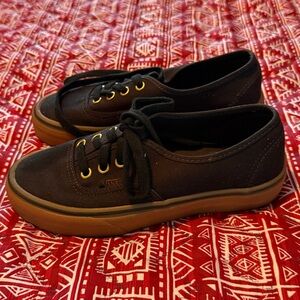 These black on rubber VAN’s shoes, with black shoe strings and gold eyelets, are so cute and like new!