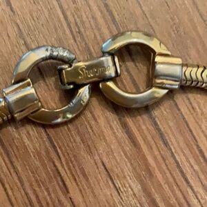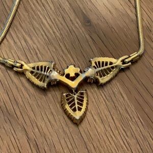This stunning Sherman signed vintage flower necklace features a beautiful combination of gold and peridot with dark green rhinestones. It is gorgeous on and makes a beautiful vintage statement piece. Necklace is 16” long and with some minor wear, clasp is a bit loose but overall good condition….see pictures for more detail. This is a pre loved piece.