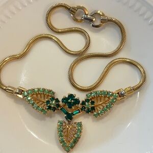 Sherman Signed Vintage Flower Design Necklace Green With Gold Tone Snake Chain.