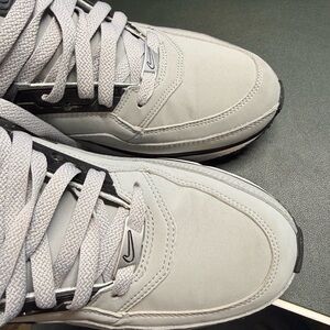 Elevate your look with these Nike Air Max sneakers. Light gray with black accents. Perfect for everyday wear.
