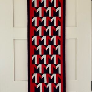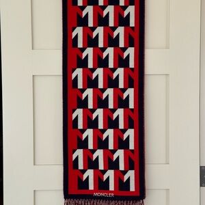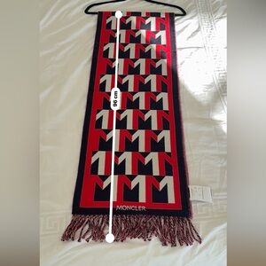 Bold Moncler scarf with striking red and dark navy pattern. Features classic fringe. Like new condition, never worn, just had it in my closet for a while. Purchased for over $500 a couple of years ago from ssense.com
