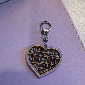 Heart-shaped keychain with a bookshelf design. Perfect for book lovers.