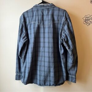 Blue Ranchwear checkered shirt with button-up front. Very pretty colored blue that will make blue eyes pop ! Plaid print, front pockets, 100 percent cotton. Snap buttons .