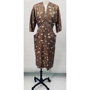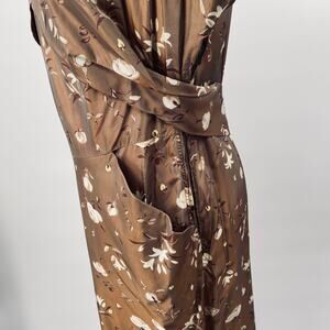 Vintage 40s 50s Floral Satin Sheath Dress V Neck Pockets Cinched Waist Brown 10