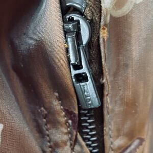 Keywords: vtg retro 1940s forties 1950s fifties 60s sixties 1960s flowers pinup rockabilly pin up classy classic elegant sophisticated chic femme feminine fitted woven satiny silky vneck metallic shiny iridescent made in USA brown gold neutral cream ivory antique traditional evening eveningwear garden party cocktail party special occasion sleek flattering belted pleated brown cream neutral roses rose